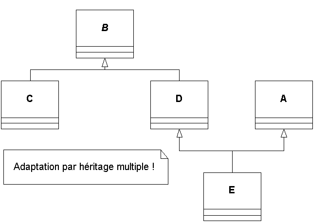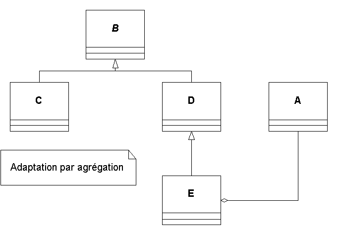 La classe E, adaptée de A vers la hiérarchie BCD doit, de toute évidence dériver de B. Toutefois, pour utiliser les méthodes de A, il y a deux solutions :
