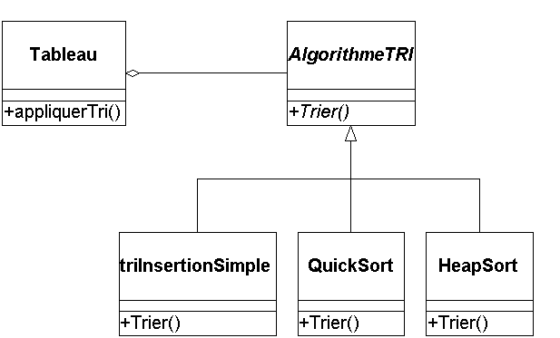 Séparer l'algorithme de tri de son contexte (le tableau) permet de modifier chacun indépendament de l'autre du moment que les interfaces ne varient pas. On obtient ainsi une plus grande souplesse ! En outre, il est facile de rajouter un nouvel algorithme de tri sans modifier pour autant la classe Tableau ou sa hiérarchie. En outre, cela permet de cacher à la classe Tableau l'implémentation des algorithmes de tri.